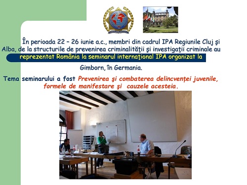 In virtutea bunelor relatii cu conducerea Centrului Mondial de Studii si Seminarii al IPA de la Castelul Gimborn, am primit o invitatie de participare in perioada 22 – 26 iunie a.c.,la seminarul nr.17, pentru 8 membri din cadrul IPA, Regiunile Alba şi Cluj, de la structurile de prevenirea criminalităţii şi investigaţii criminale.